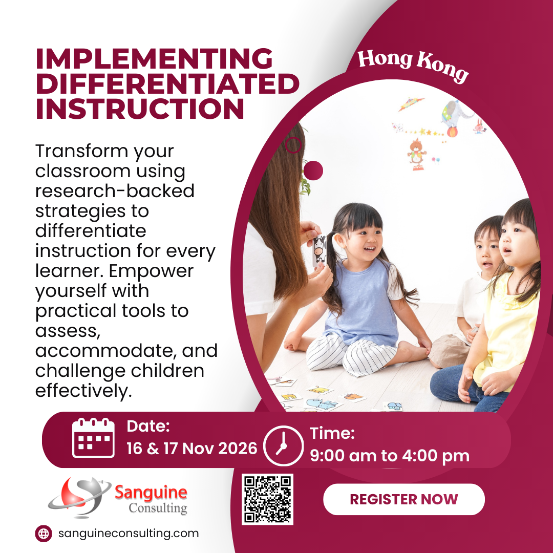 - Implementing Differentiated Instruction in Classrooms (Early/Elementary) – 16 Nov 2026 – 17 Nov 2026 – 9:00 am – 4:00 pm – Hong Kong